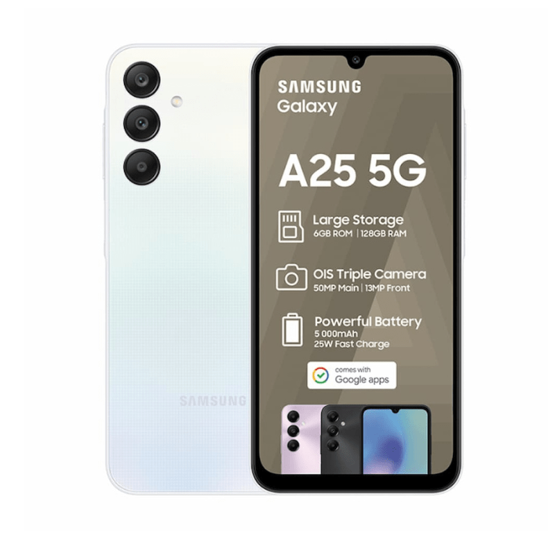 Samsung Galaxy A25 – 6GB RAM, 128GB ROM, 50MP camera, 6.5″ Super AMOLED display, and 5000mAh battery.